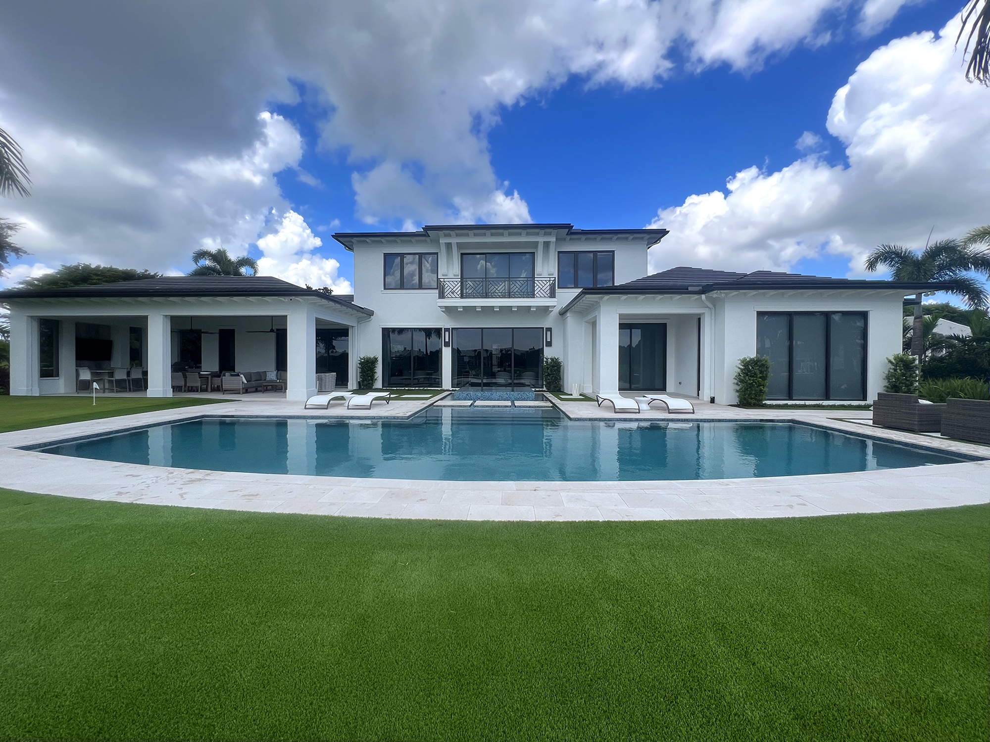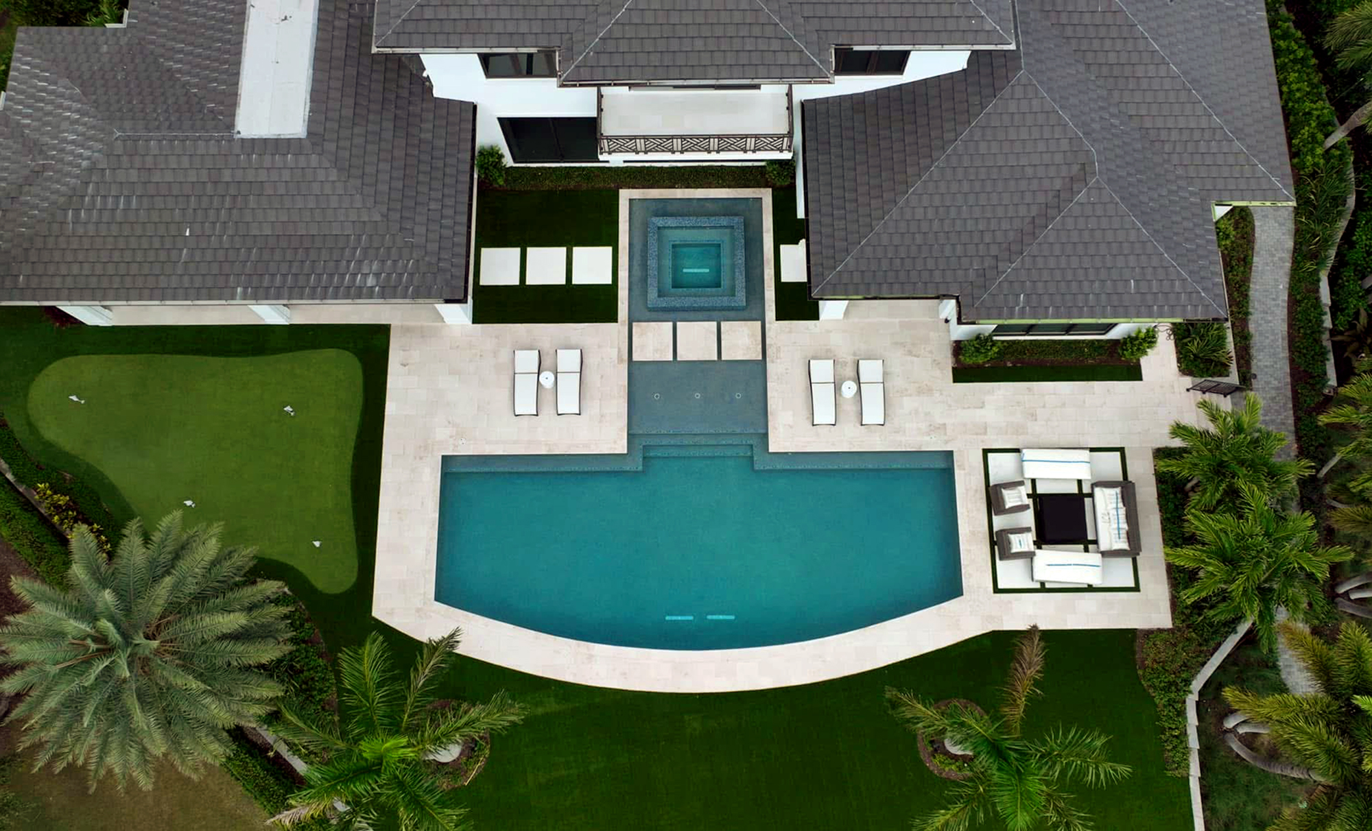 Raised Hot Tub, Scupper, Organic Shape, New Pool Build, Bubblers, LED Lighting, Travertine