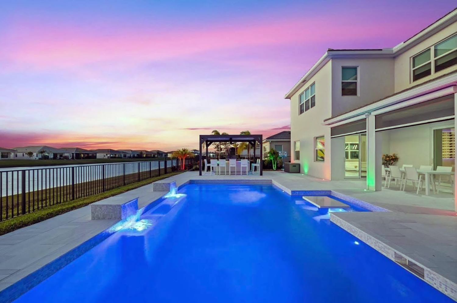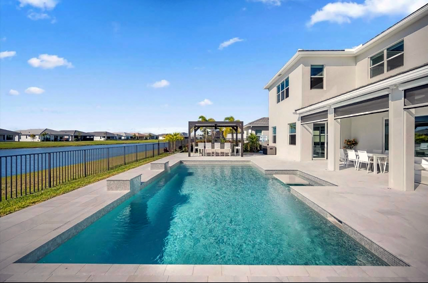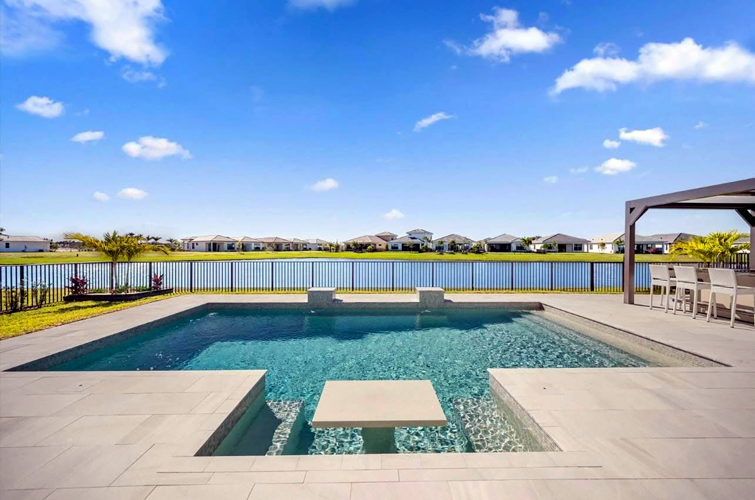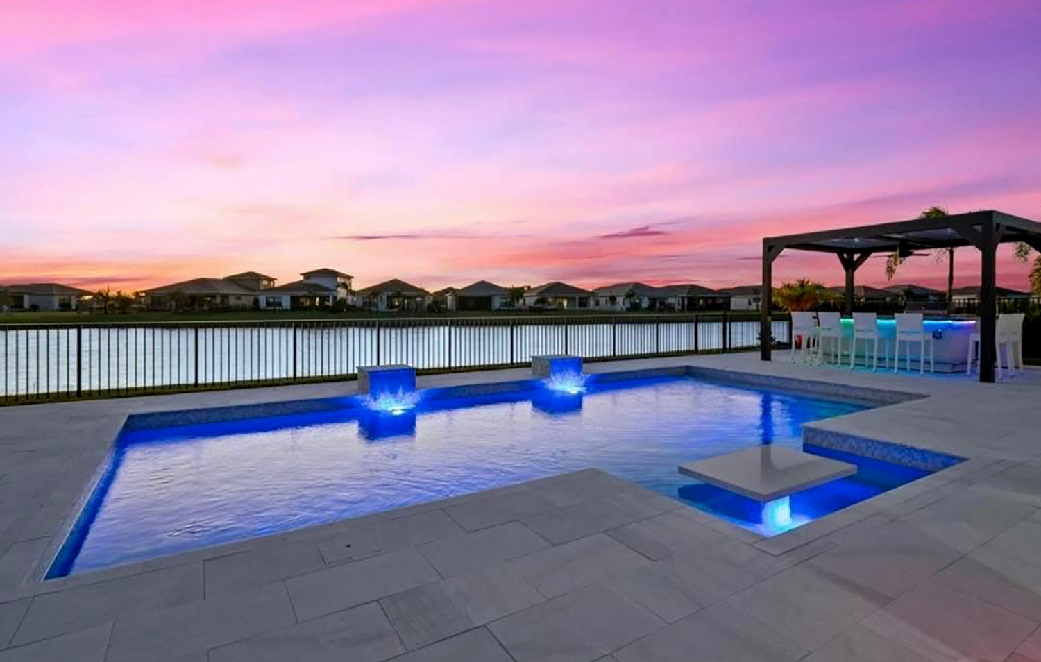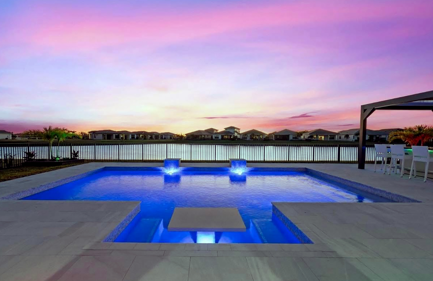 Hot Tub, Scupper, Straight Lines, Sundeck, New Pool Build, Bubblers, LED Lighting